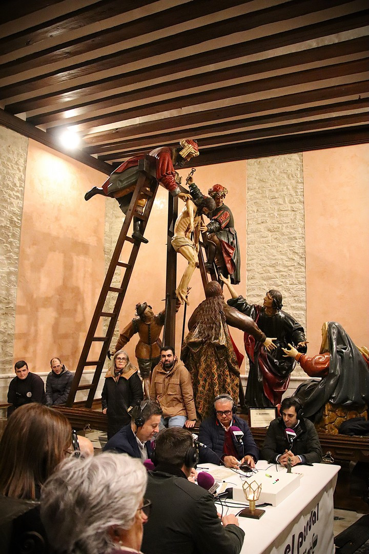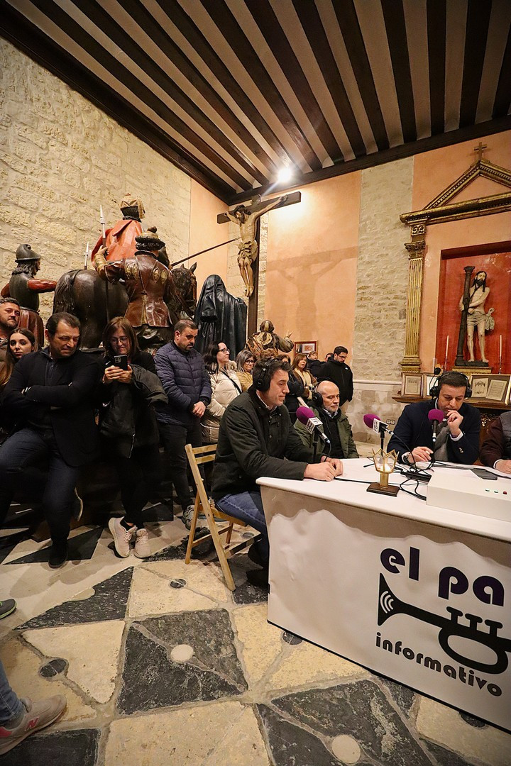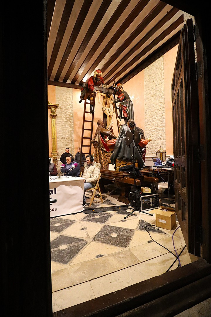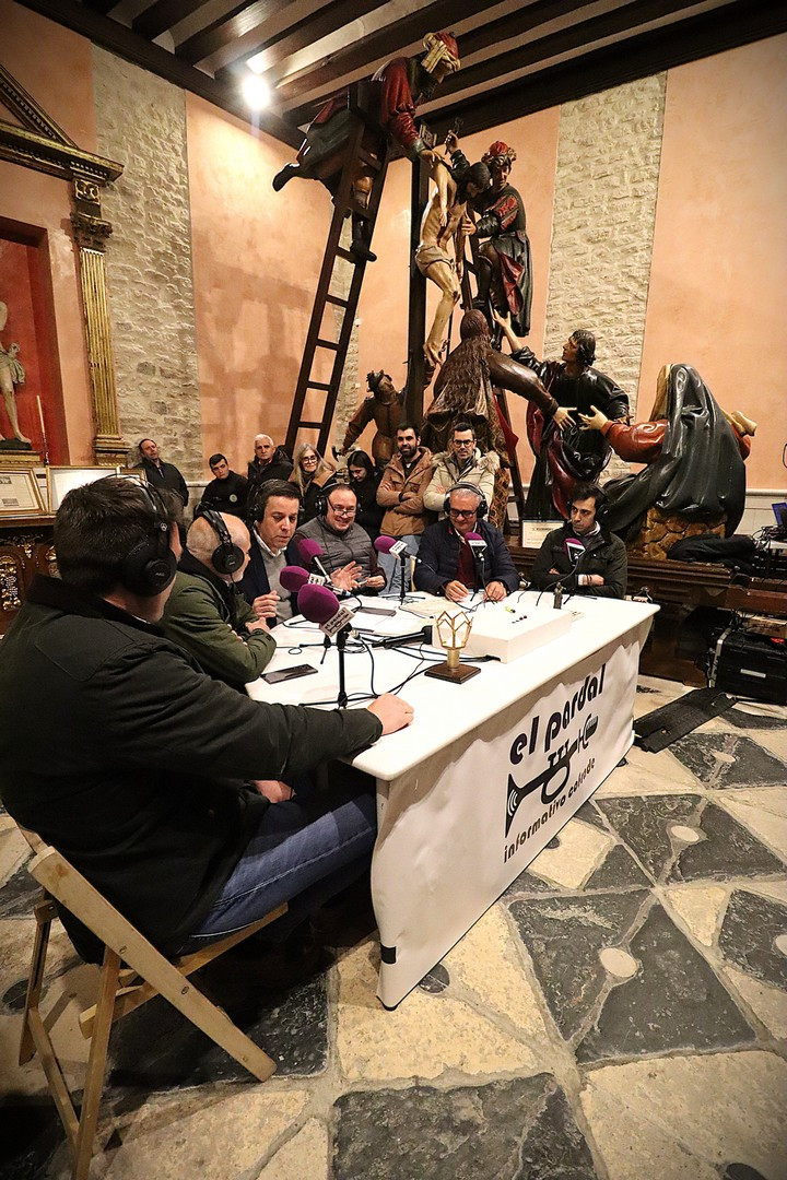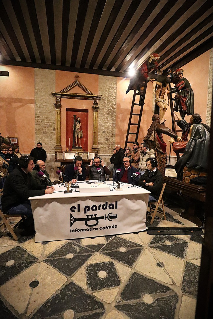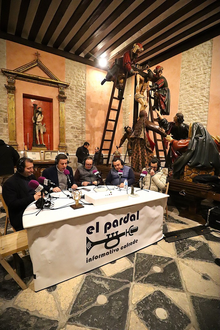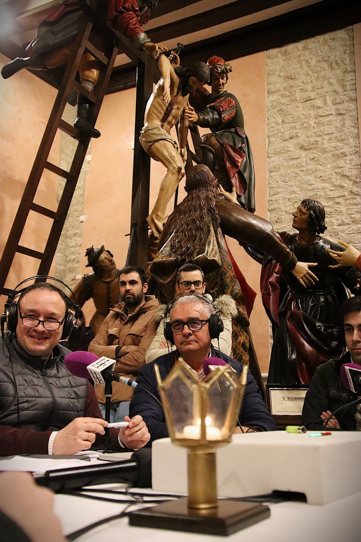 Junto a los mayordomos, estuvieron los cadenas 2025 Julen Mateo y Miguel Pérez Fuentes, quienes recordaron cómo fue esa experiencia inolvidable de sacar estos dos pasos Grandes ocupando el puesto de mayor responsabilidad. Todo el programa estuvo dedicado a Longinos y Escalera. De esta forma, la sección Un poso con… entrevistó a Óscar De Castro Manrique (Descendimiento) y El cofrade en la distancia viajó hasta Madrid para conocer la historia de Ana Pascual (Crucifixión). La voz del ayer rescató los sonidos que hablaban de esa primera gran restauración de la capilla en 1998 y no faltaron secciones habituales como ‘Un minuto con don Alberto’, Boletín cofrade y la Agenda.