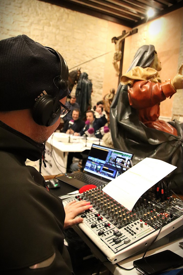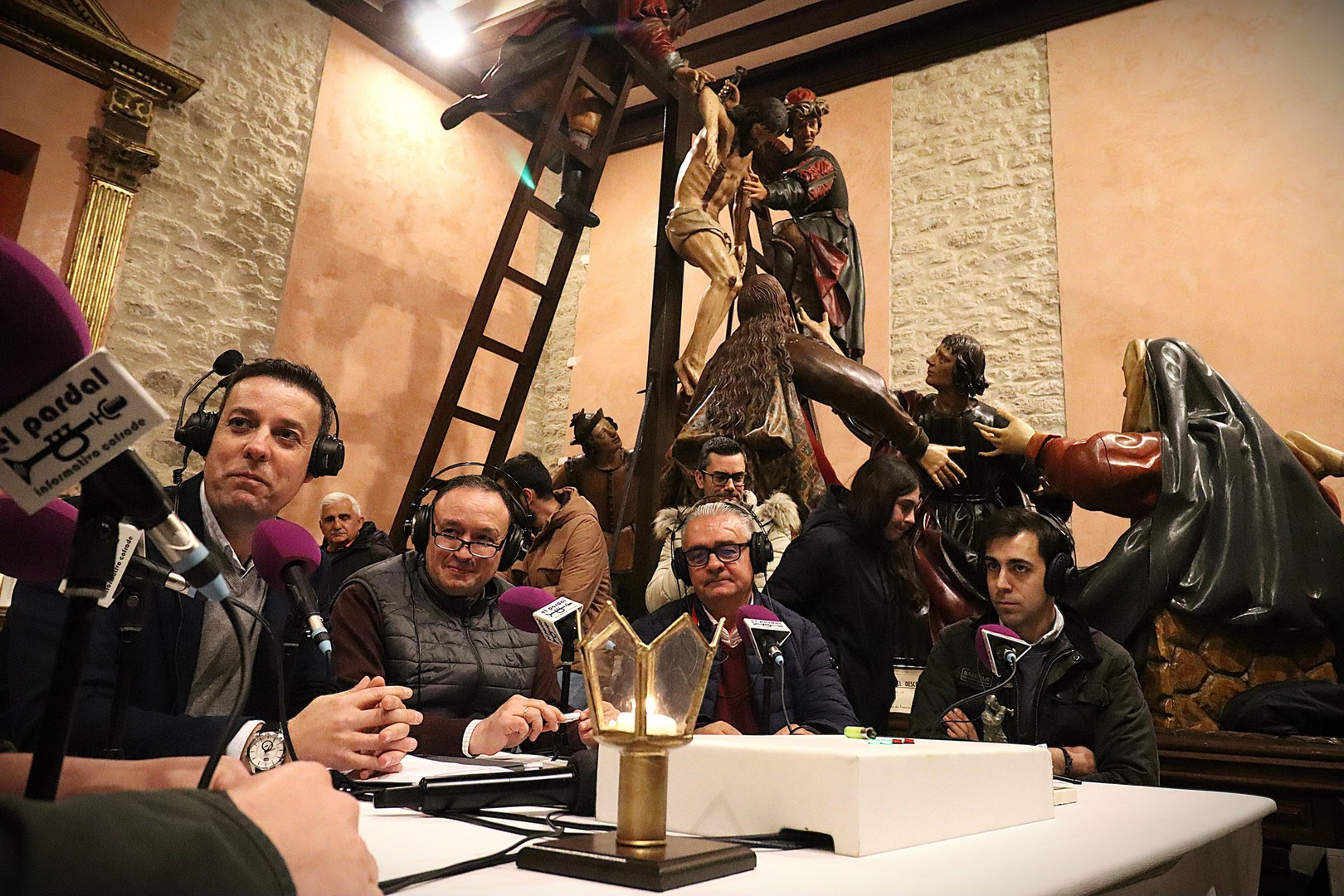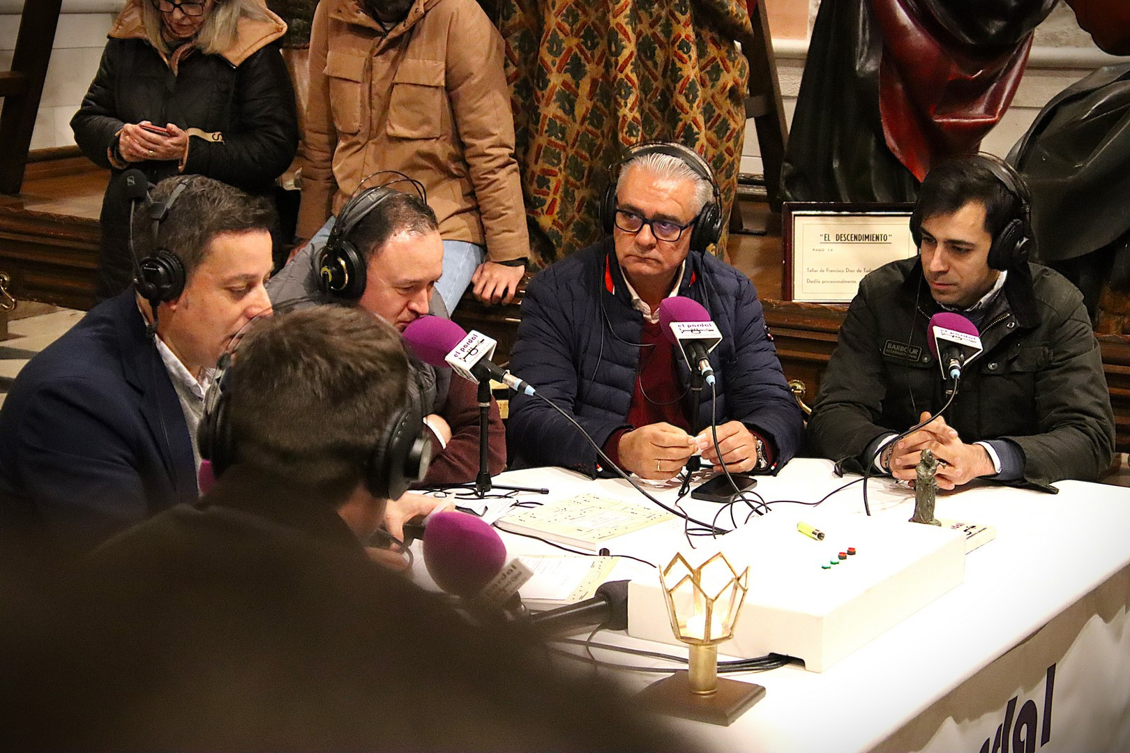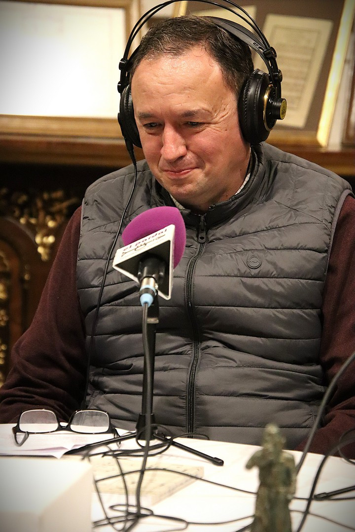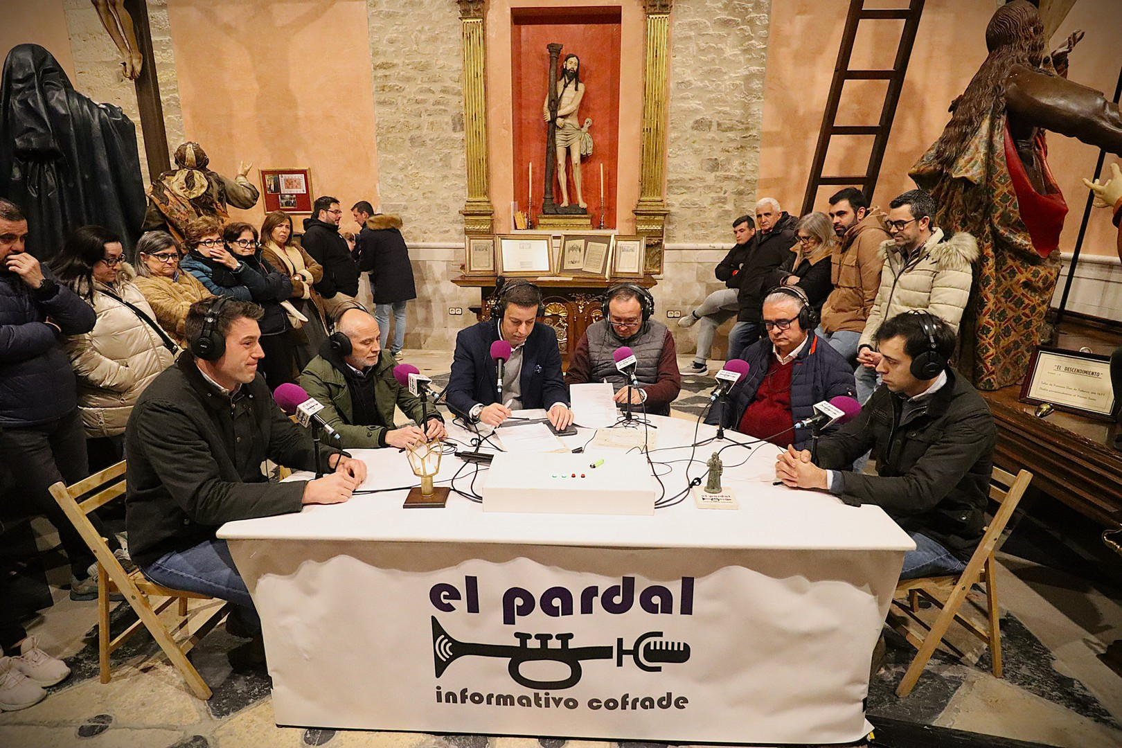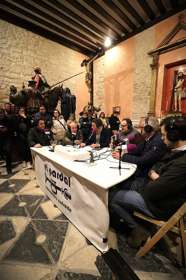 Junto a los mayordomos, estuvieron los cadenas 2025 Julen Mateo y Miguel Pérez Fuentes, quienes recordaron cómo fue esa experiencia inolvidable de sacar estos dos pasos Grandes ocupando el puesto de mayor responsabilidad. Todo el programa estuvo dedicado a Longinos y Escalera. De esta forma, la sección Un poso con… entrevistó a Óscar De Castro Manrique (Descendimiento) y El cofrade en la distancia viajó hasta Madrid para conocer la historia de Ana Pascual (Crucifixión). La voz del ayer rescató los sonidos que hablaban de esa primera gran restauración de la capilla en 1998 y no faltaron secciones habituales como ‘Un minuto con don Alberto’, Boletín cofrade y la Agenda.