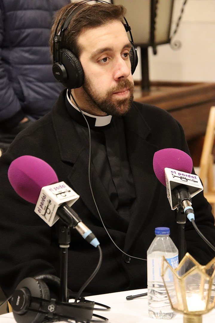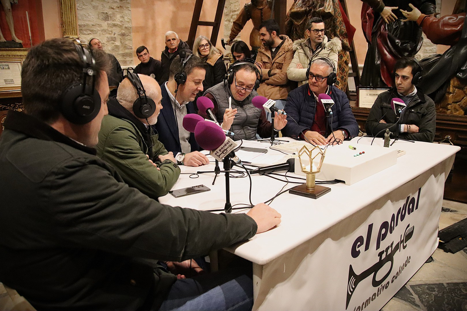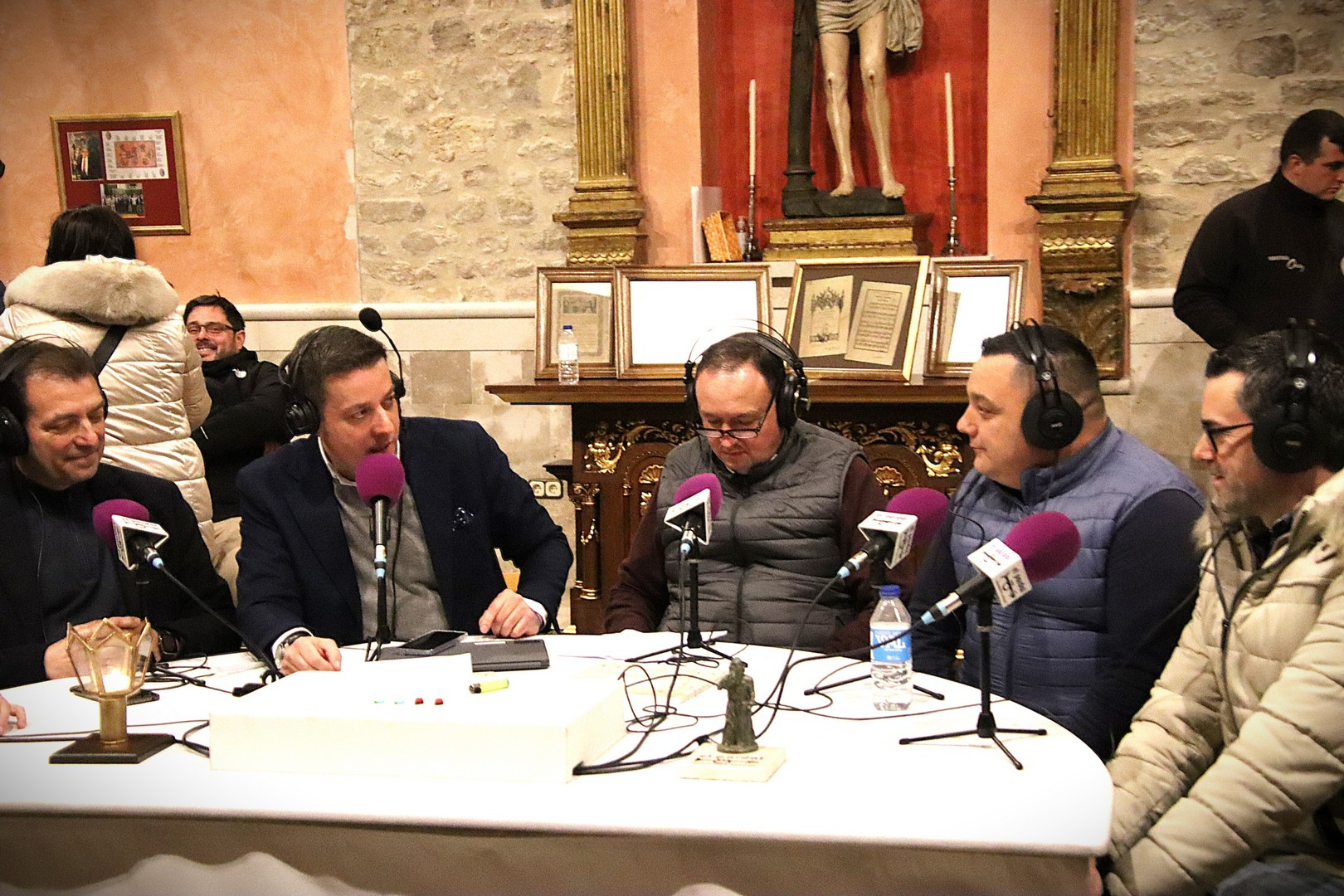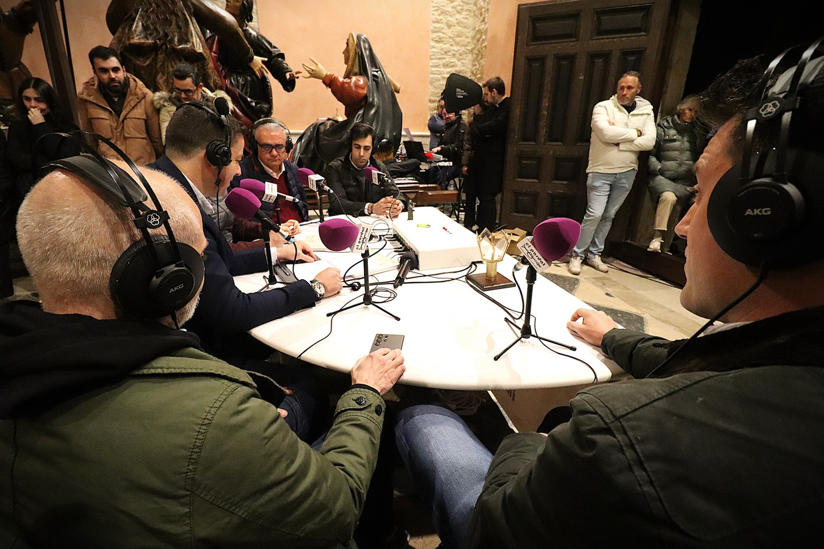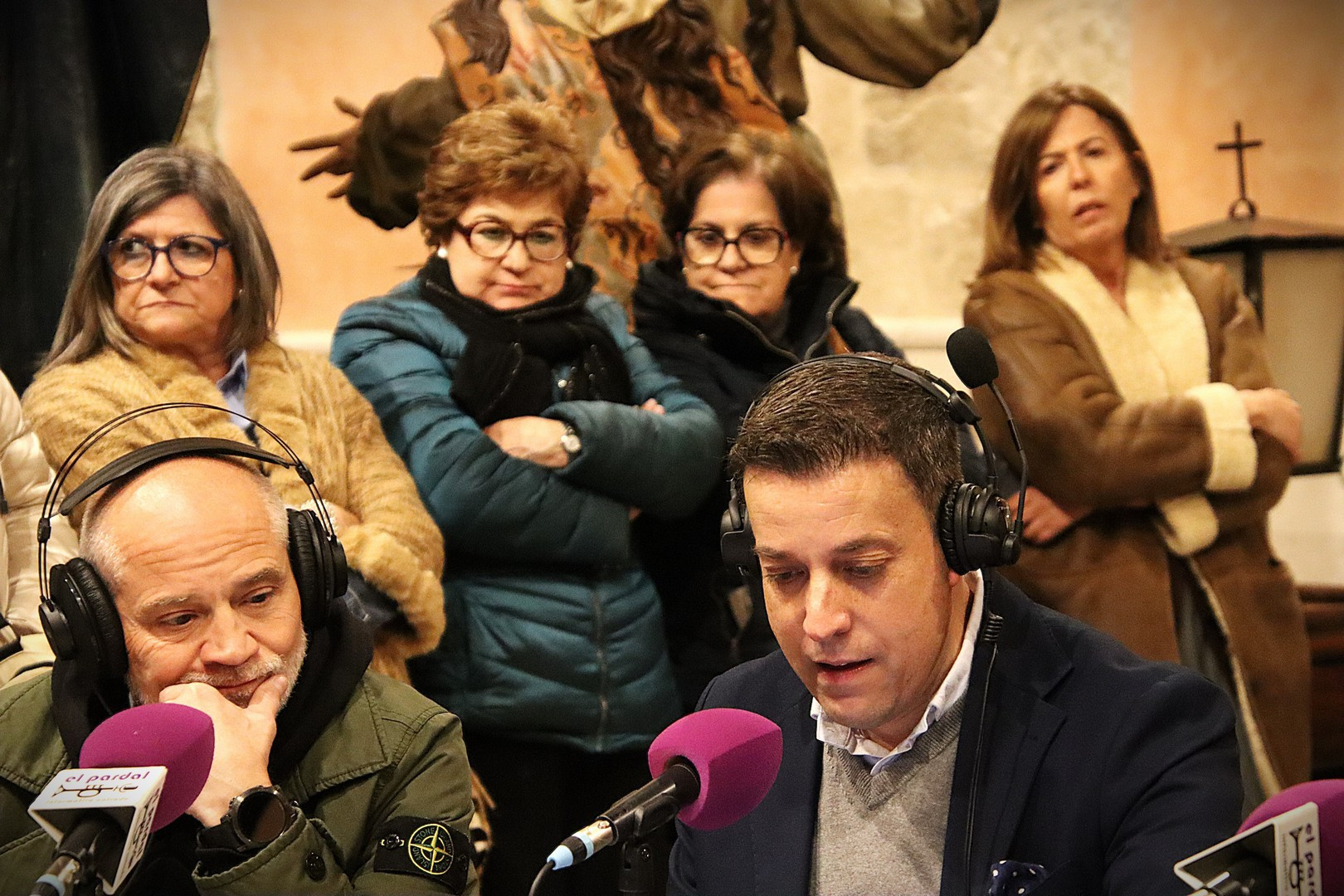 Junto a los mayordomos, estuvieron los cadenas 2025 Julen Mateo y Miguel Pérez Fuentes, quienes recordaron cómo fue esa experiencia inolvidable de sacar estos dos pasos Grandes ocupando el puesto de mayor responsabilidad. Todo el programa estuvo dedicado a Longinos y Escalera. De esta forma, la sección Un poso con… entrevistó a Óscar De Castro Manrique (Descendimiento) y El cofrade en la distancia viajó hasta Madrid para conocer la historia de Ana Pascual (Crucifixión). La voz del ayer rescató los sonidos que hablaban de esa primera gran restauración de la capilla en 1998 y no faltaron secciones habituales como ‘Un minuto con don Alberto’, Boletín cofrade y la Agenda.