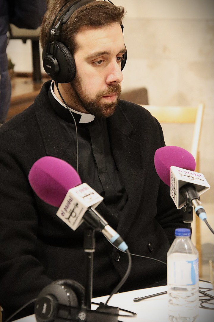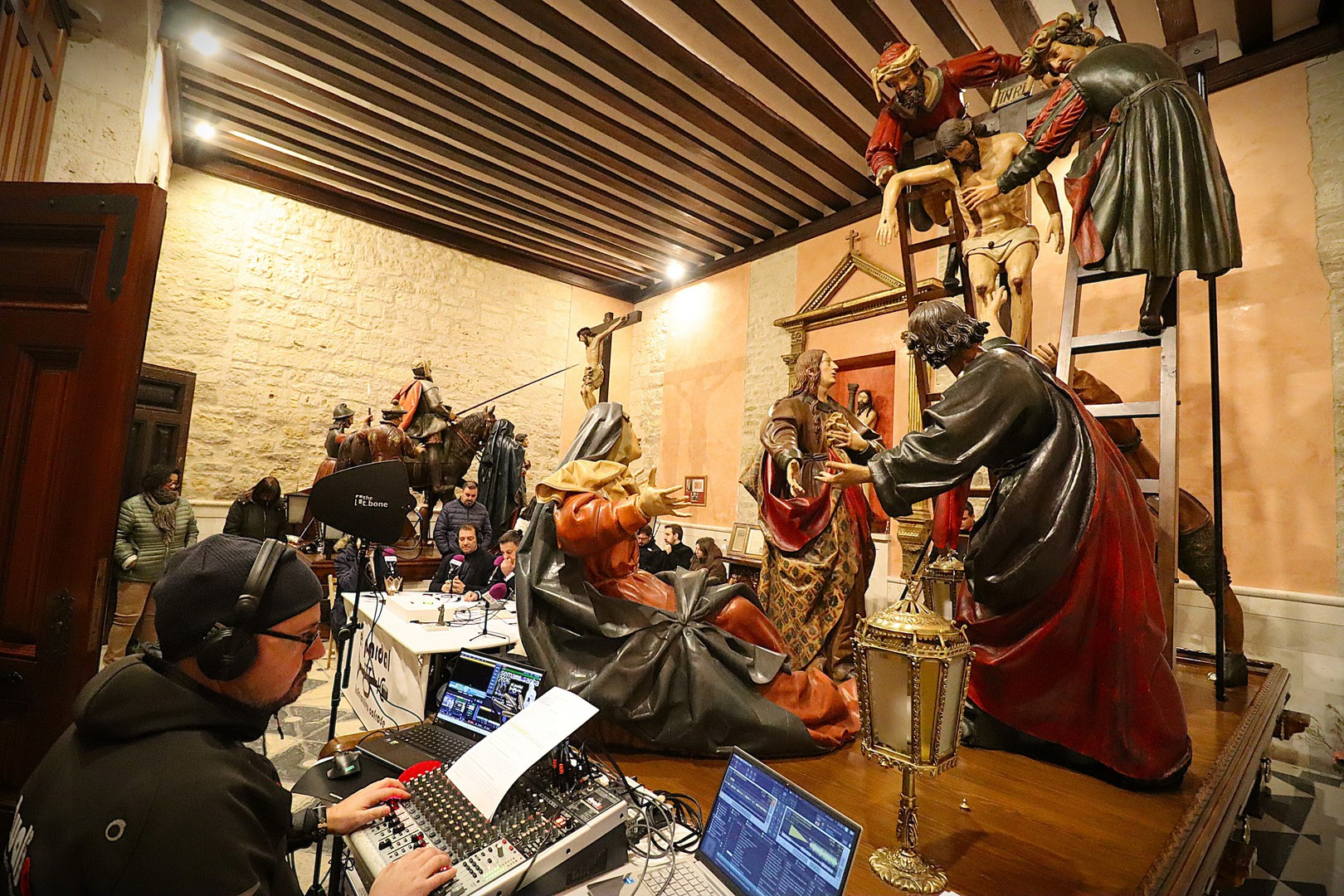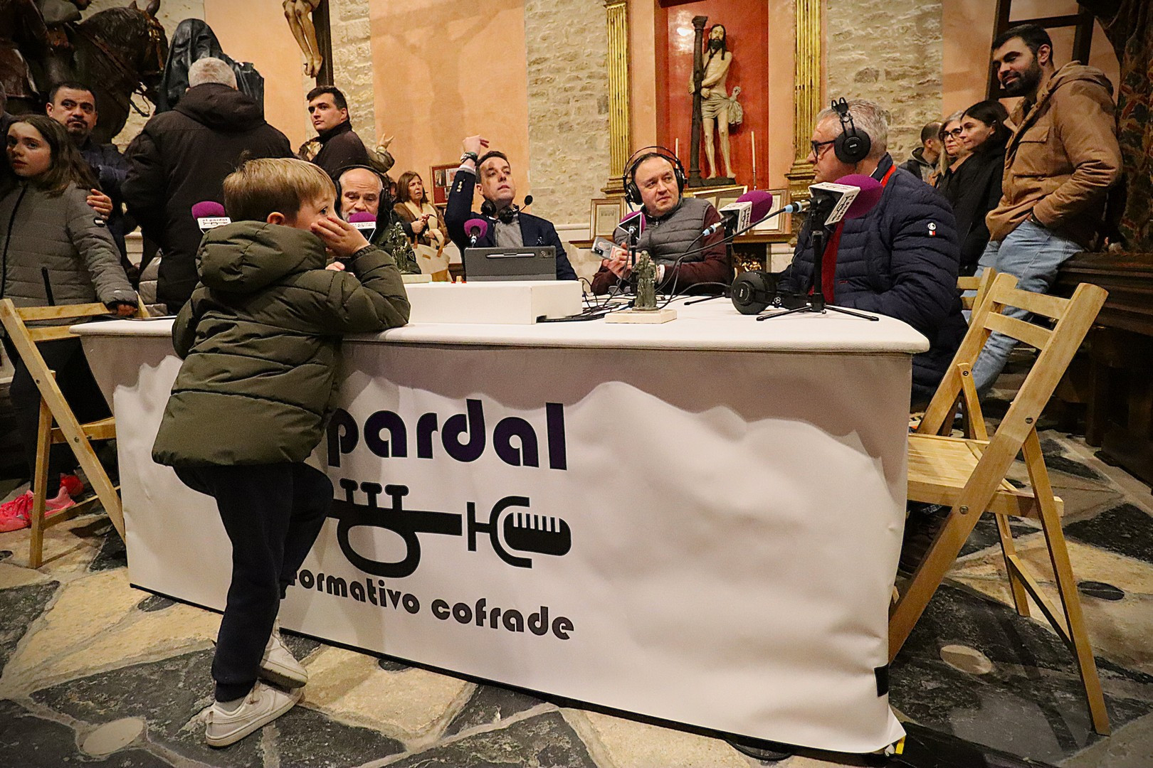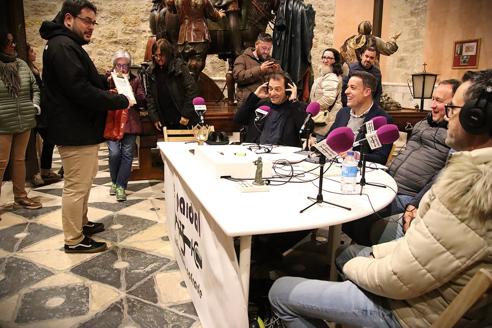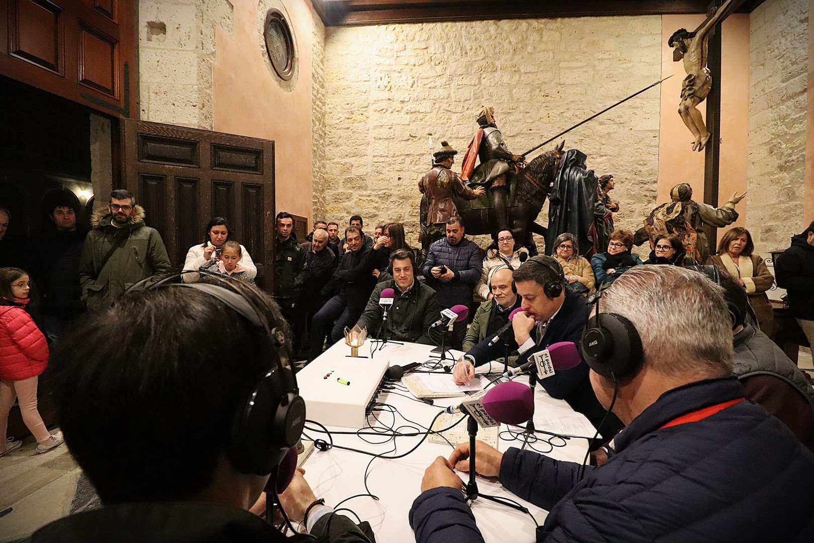 Junto a los mayordomos, estuvieron los cadenas 2025 Julen Mateo y Miguel Pérez Fuentes, quienes recordaron cómo fue esa experiencia inolvidable de sacar estos dos pasos Grandes ocupando el puesto de mayor responsabilidad. Todo el programa estuvo dedicado a Longinos y Escalera. De esta forma, la sección Un poso con… entrevistó a Óscar De Castro Manrique (Descendimiento) y El cofrade en la distancia viajó hasta Madrid para conocer la historia de Ana Pascual (Crucifixión). La voz del ayer rescató los sonidos que hablaban de esa primera gran restauración de la capilla en 1998 y no faltaron secciones habituales como ‘Un minuto con don Alberto’, Boletín cofrade y la Agenda.