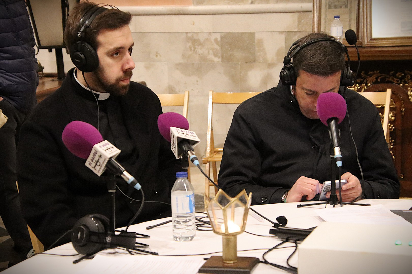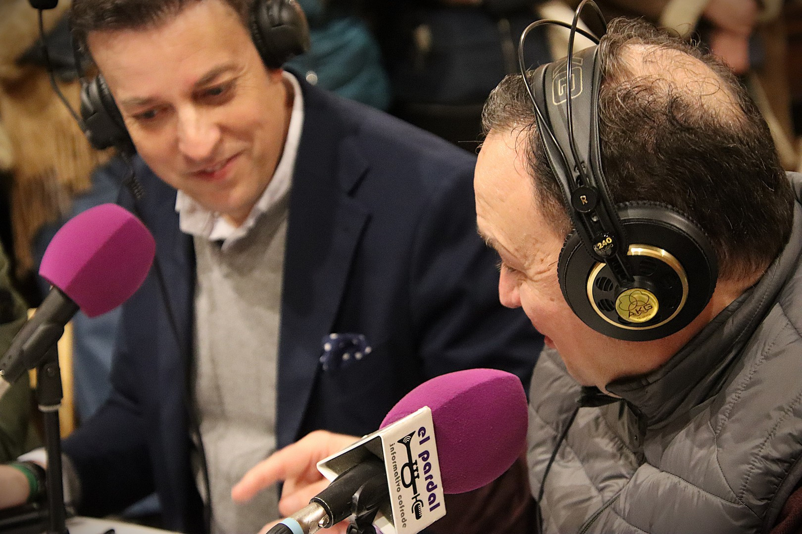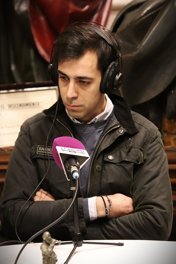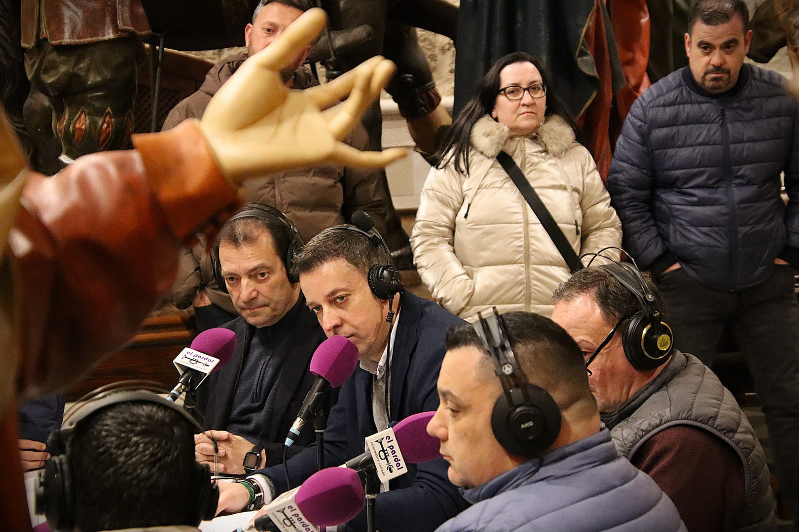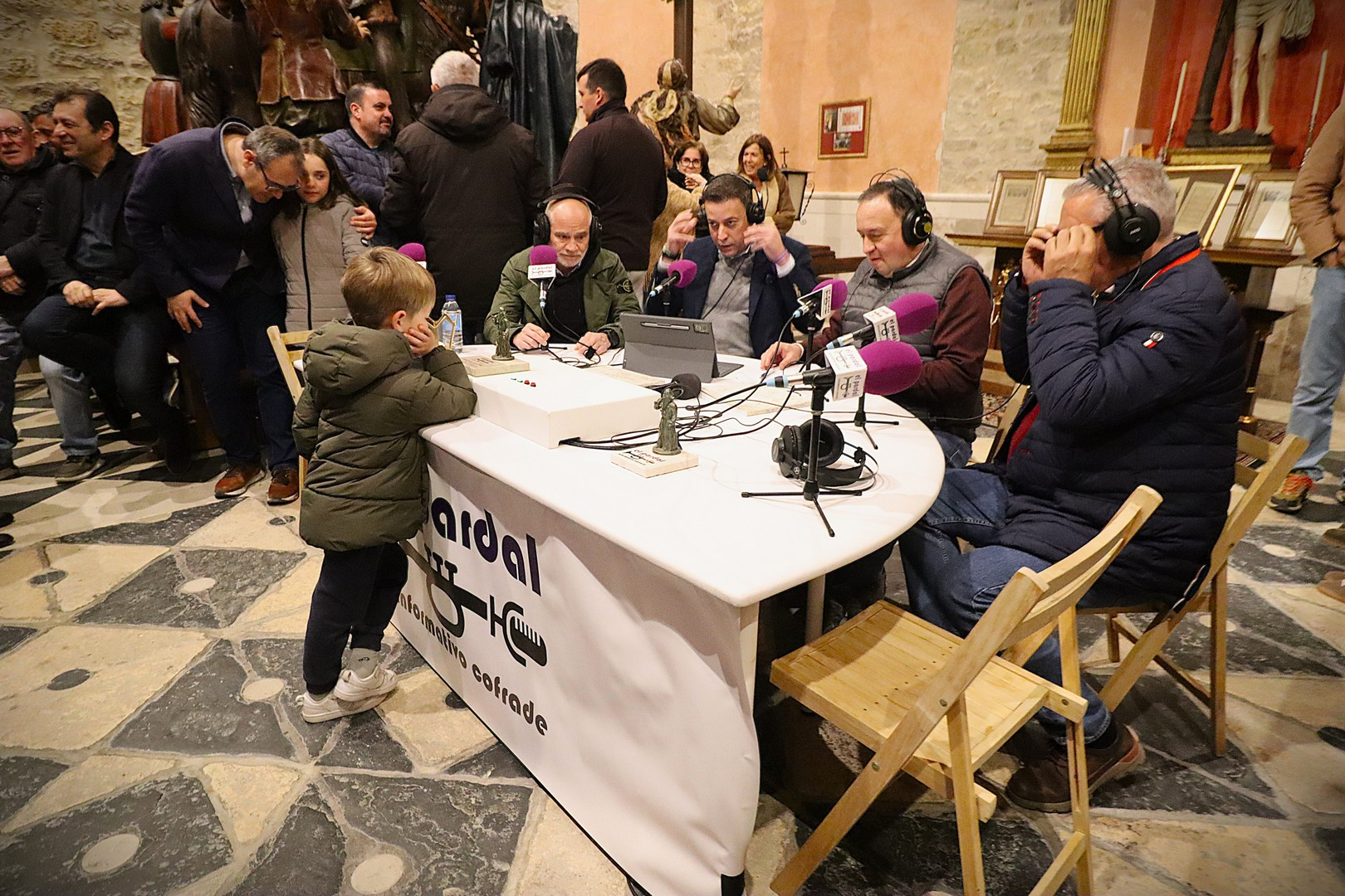 Junto a los mayordomos, estuvieron los cadenas 2025 Julen Mateo y Miguel Pérez Fuentes, quienes recordaron cómo fue esa experiencia inolvidable de sacar estos dos pasos Grandes ocupando el puesto de mayor responsabilidad. Todo el programa estuvo dedicado a Longinos y Escalera. De esta forma, la sección Un poso con… entrevistó a Óscar De Castro Manrique (Descendimiento) y El cofrade en la distancia viajó hasta Madrid para conocer la historia de Ana Pascual (Crucifixión). La voz del ayer rescató los sonidos que hablaban de esa primera gran restauración de la capilla en 1998 y no faltaron secciones habituales como ‘Un minuto con don Alberto’, Boletín cofrade y la Agenda.