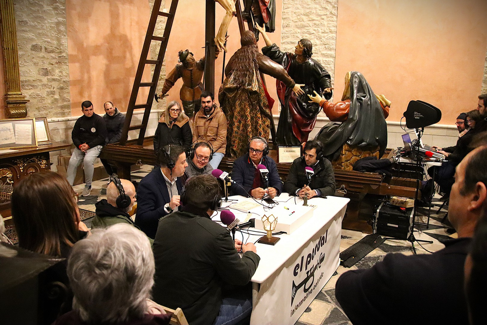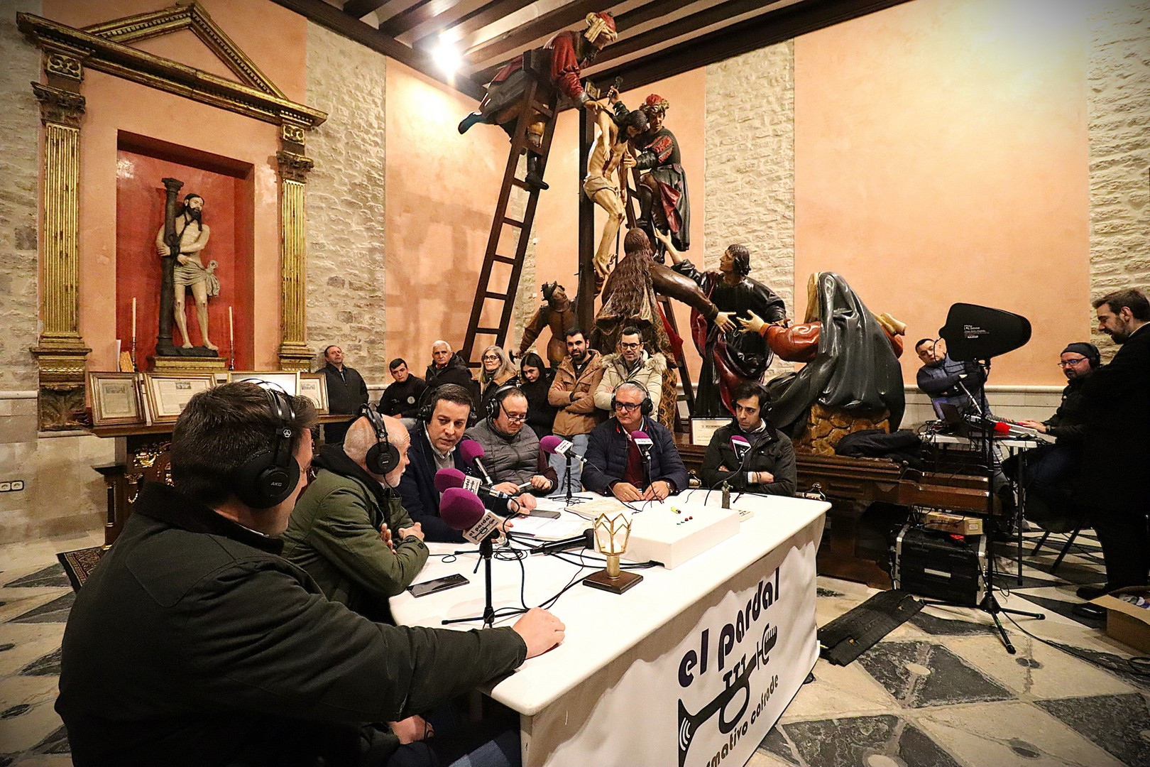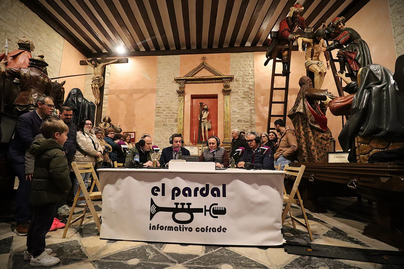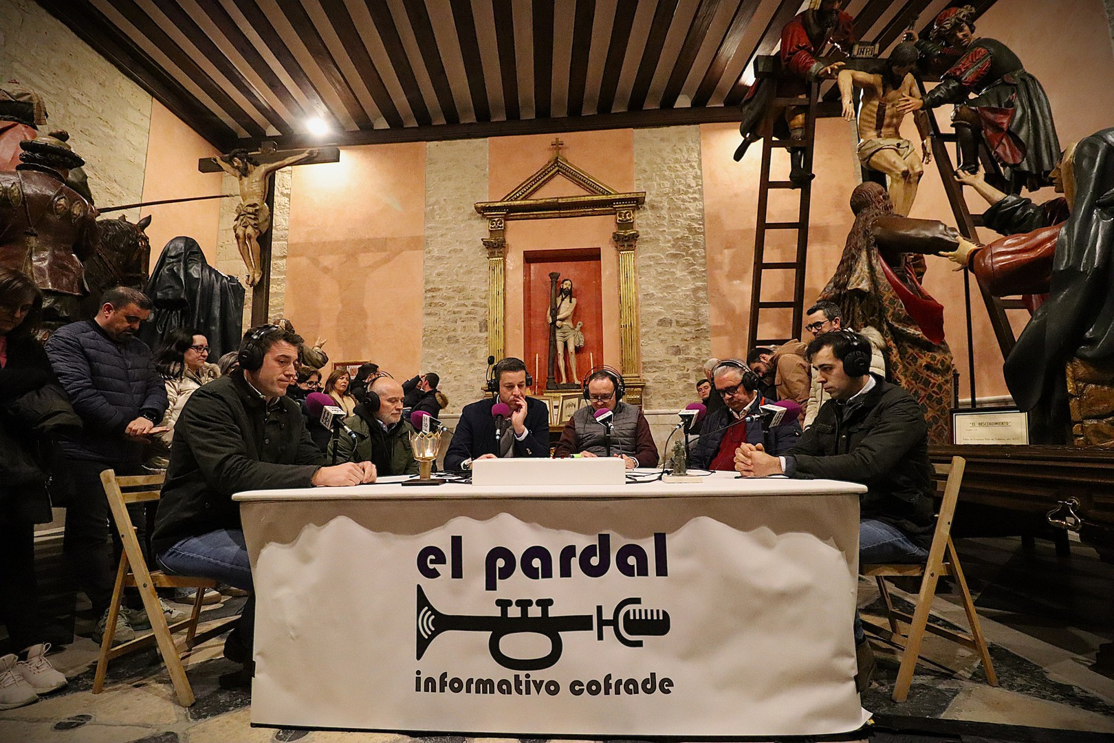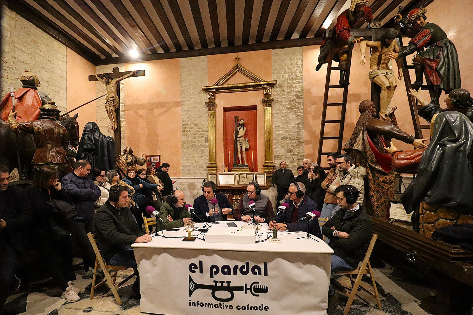 La Capilla de los Pasos Grandes fue el escenario este miércoles 25 de marzo donde poner el punto y final a la decimoquinta edición del programa radiofónico El Pardal Informativo Cofrade, tras seis intensos programas en esta Cuaresma 2026. Este salón de pasos, construido en 1664, y reformado en 1998, ha sufrido este año otro proceso de rehabilitación, especialmente en su respaldo posterior. Es lo que contaron el alcalde de Rioseco, David Esteban; el presidente de la Crucifixión, Javier Ubal; el vicepresidente del Descendimiento, Manuel Calvo y el muñidor de La Escalera, Daniel Barrios.
